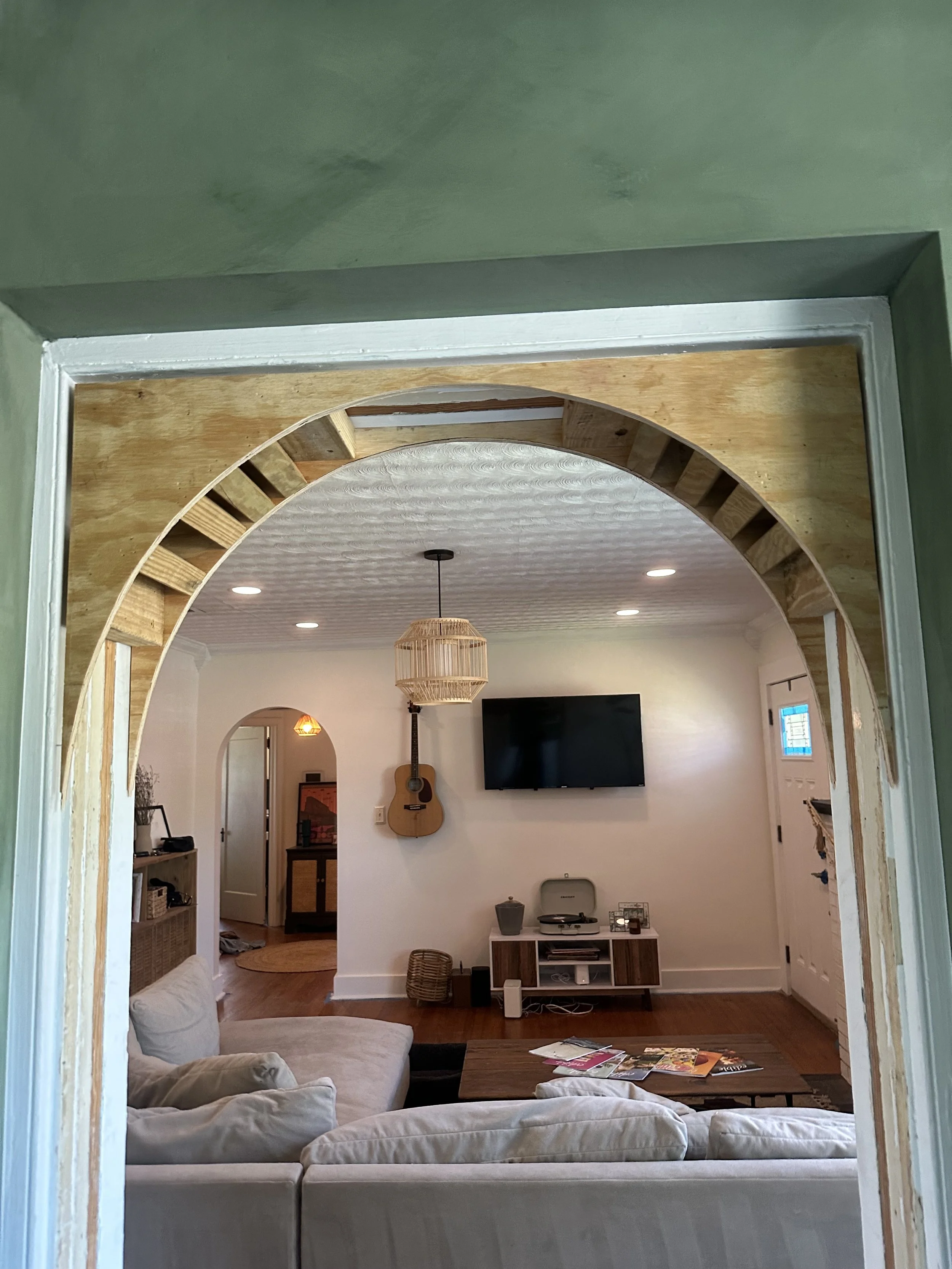 I removed the doorway hardware and trim, framed out the archway and then added the drywall. After smoothing the seams I matched texture and painted to match the living and meditation rooms.